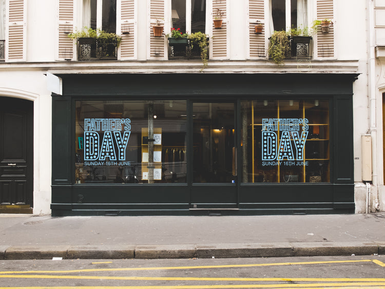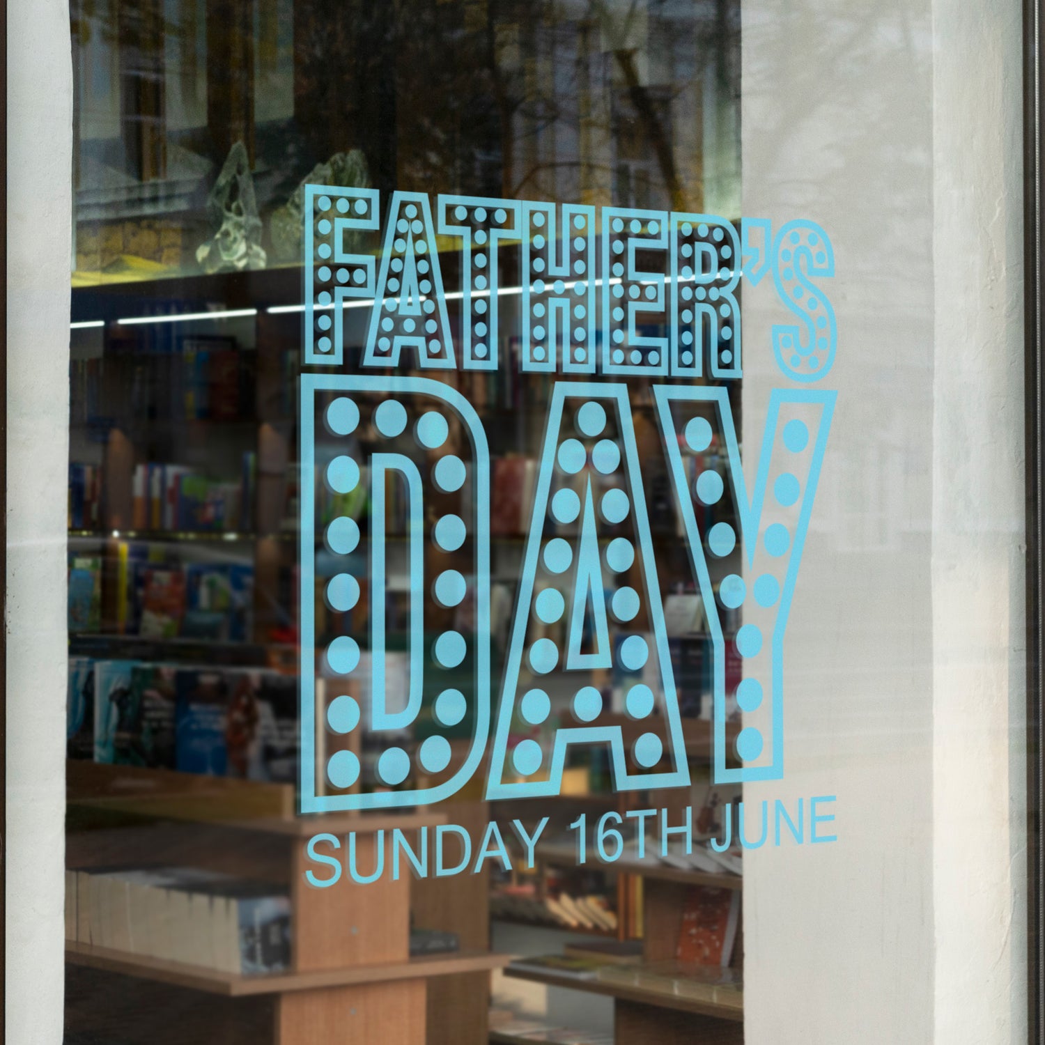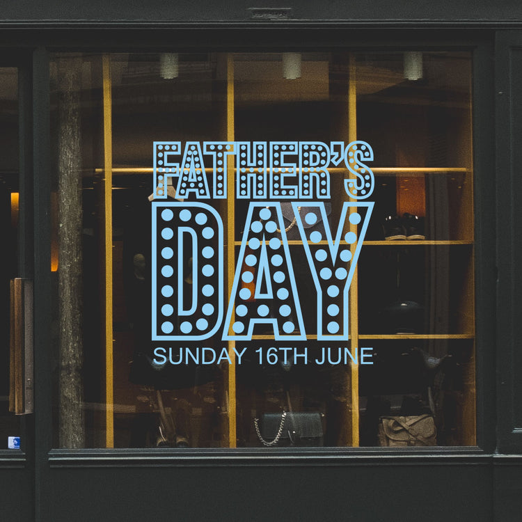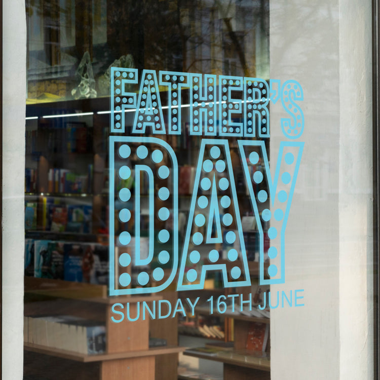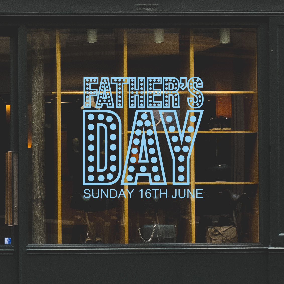 Father's Day in lights retail shop window sticker vinyl featuring the date.