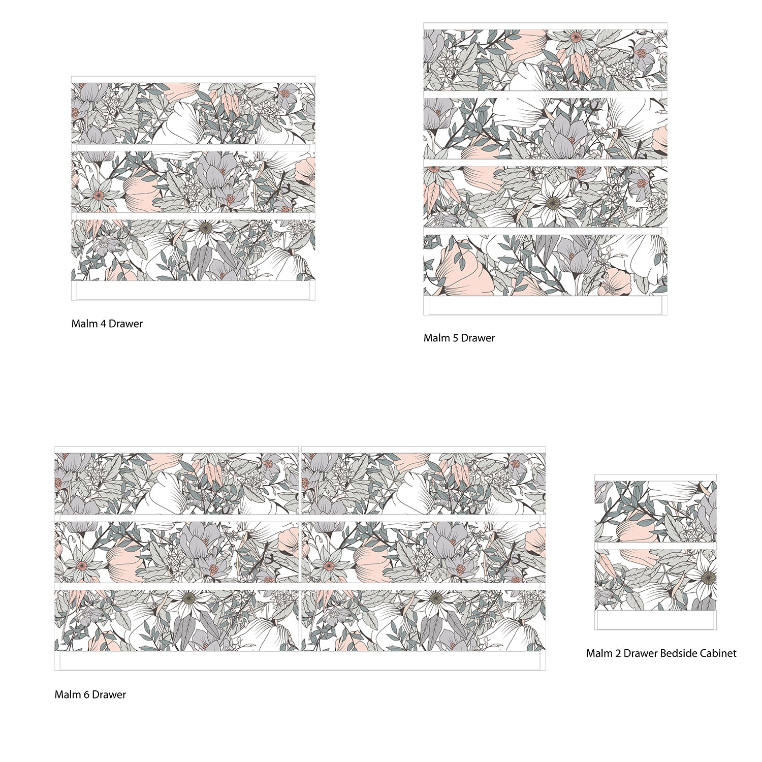 Pink and grey floral stickers - Ikea hack for Malm drawers