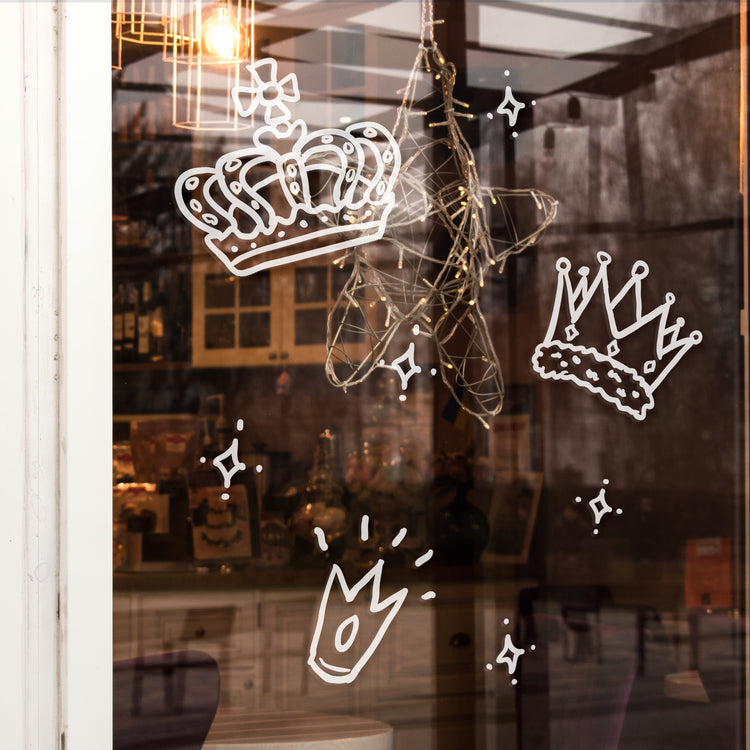 Set of crowns Kings coronation retail window graphics! These graphics are designed to bring a regal and celebratory atmosphere to your storefront.