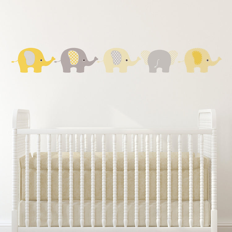 Featuring five adorable, intricately designed elephants in soft yellow and grey tones, this set is perfect for nurseries, playrooms, or toddler bedrooms.