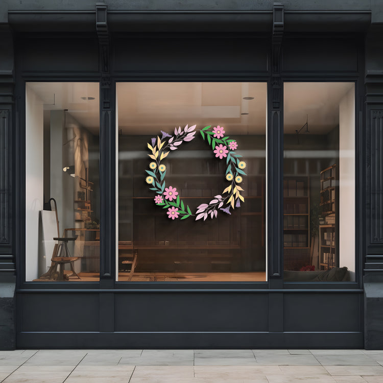 Elevate your store's seasonal display with our Spring Wreath Retail Shop Window Sticker Vinyl. Perfect for capturing the essence of spring, these vibrant decals are designed to attract customers and enhance your visual merchandising.