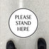 Please stand here social distancing floor graphic in a circular design.