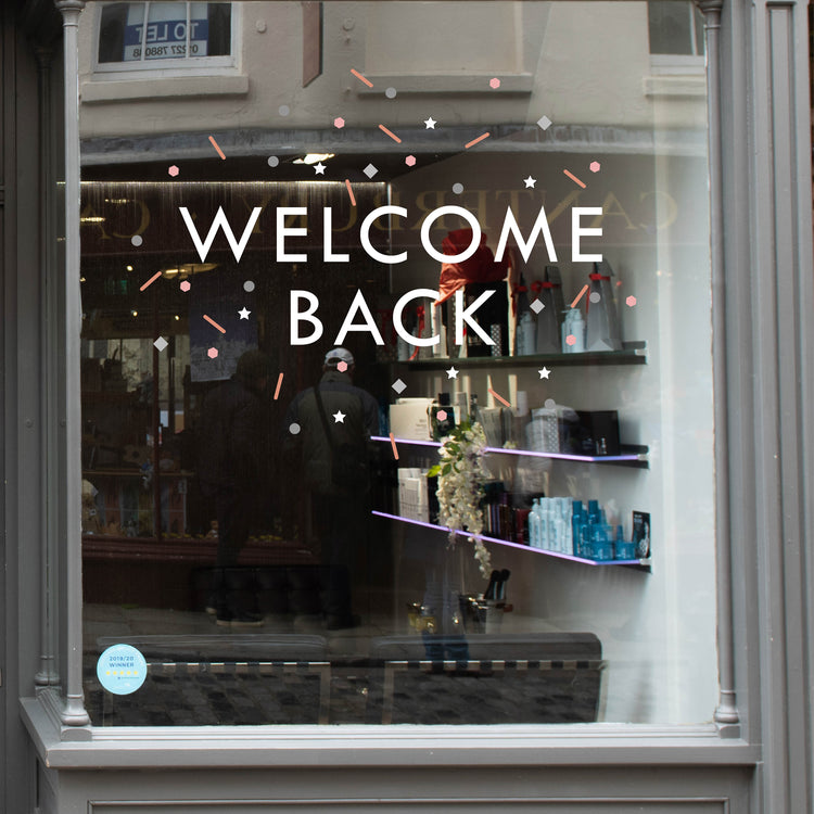 'Welcome Back' scatter confetti retail graphic window vinyl.